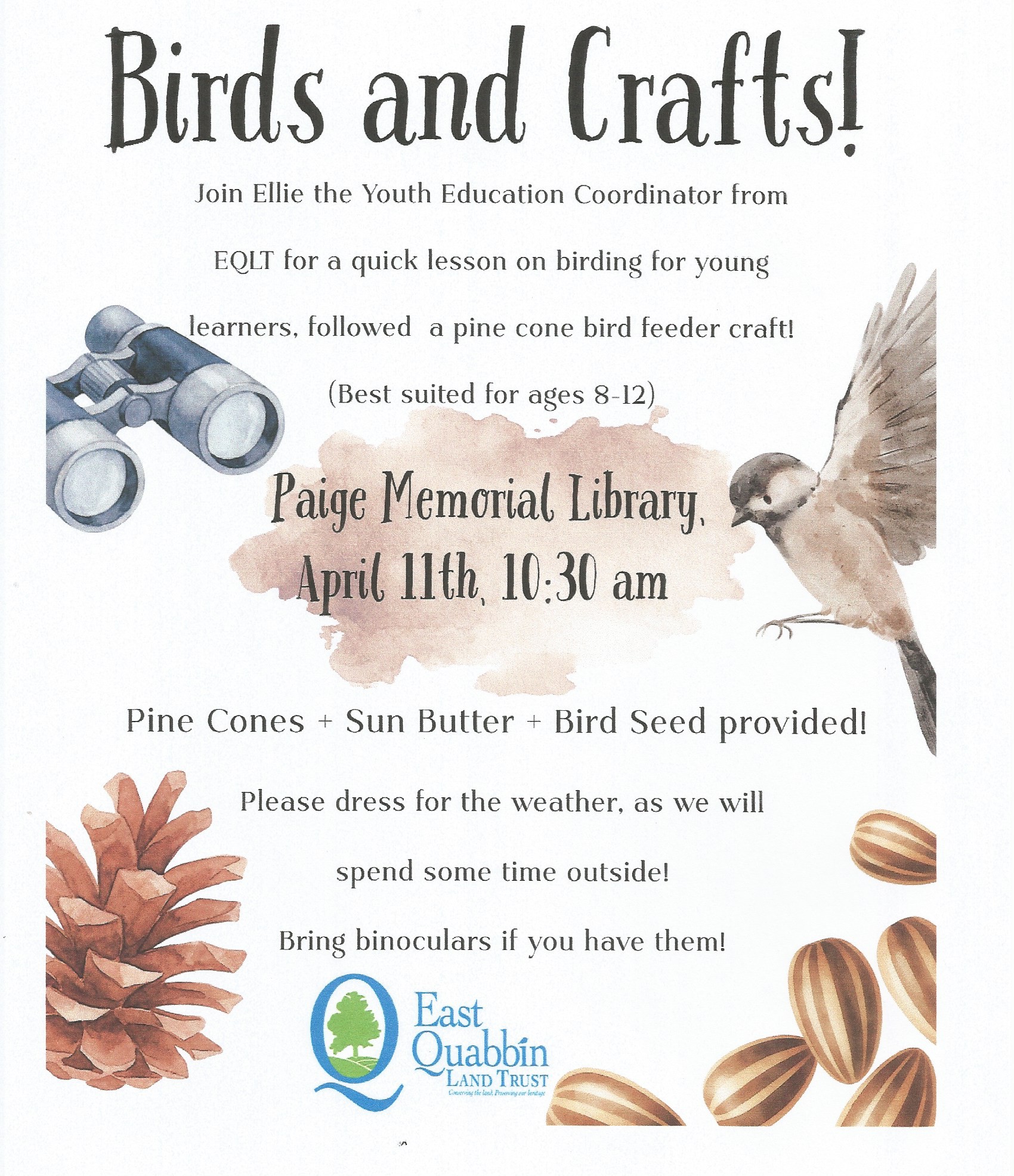 April 11, Saturday, 10:30 am – Join Ellie Shea, Youth Education Coordinator from the East Quabbin Land Trust for a quick lesson on birding for young learners and the creation of a classic pine cone bird feeder craft using sunflower seed butter rather than peanut butter! Please bring binoculars if you have them. We will spend some time outside birding! This program is best suited for ages 8 to 12, younger kids are welcome but will likely require hands-on help from parents.